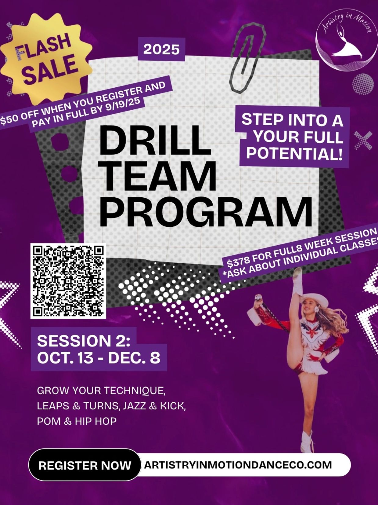 Whether you're preparing to audition for a high school drill team or looking to sharpen your performance as a current team member, our Drill Team Program is designed to help dancers step into their full potential. At Artistry in Motion Dance Company, we provide high-level technique training, team-style choreography, and performance prep in a supportive, driven environment.